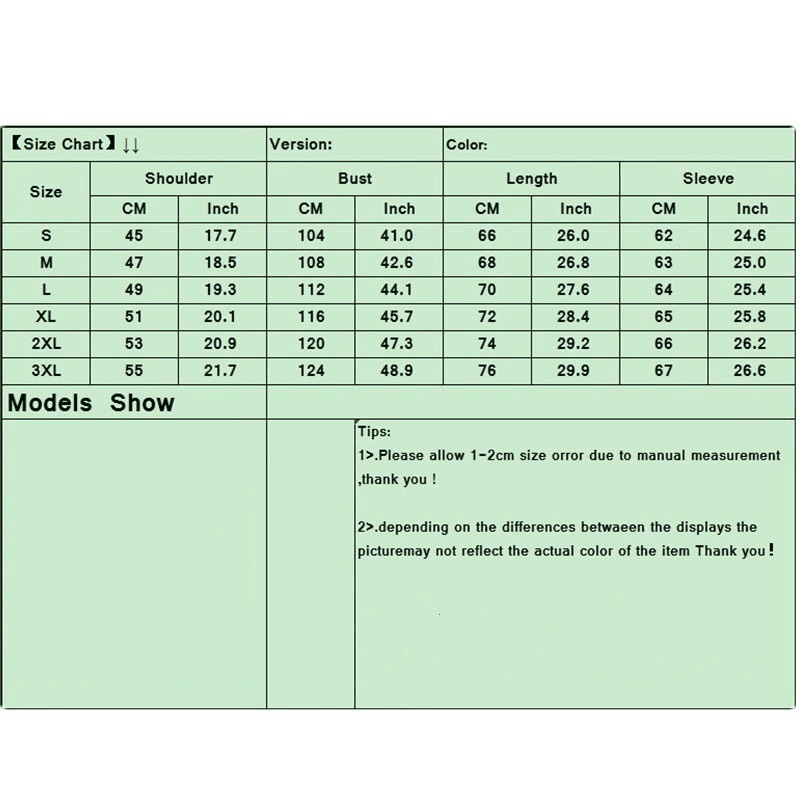 1. Asian sizes are 1 to 2 sizes smaller than European and American people. Choose the larger size if your size between two sizes. Please allow 2-3cm differences due to manual measurement. 2. Please check the size chart carefully before you buy the item, if you don't know how to choose size, please contact our customer service. 3.As you know, the different computers display colors differently, the color of the actual item may vary slightly from the following images.