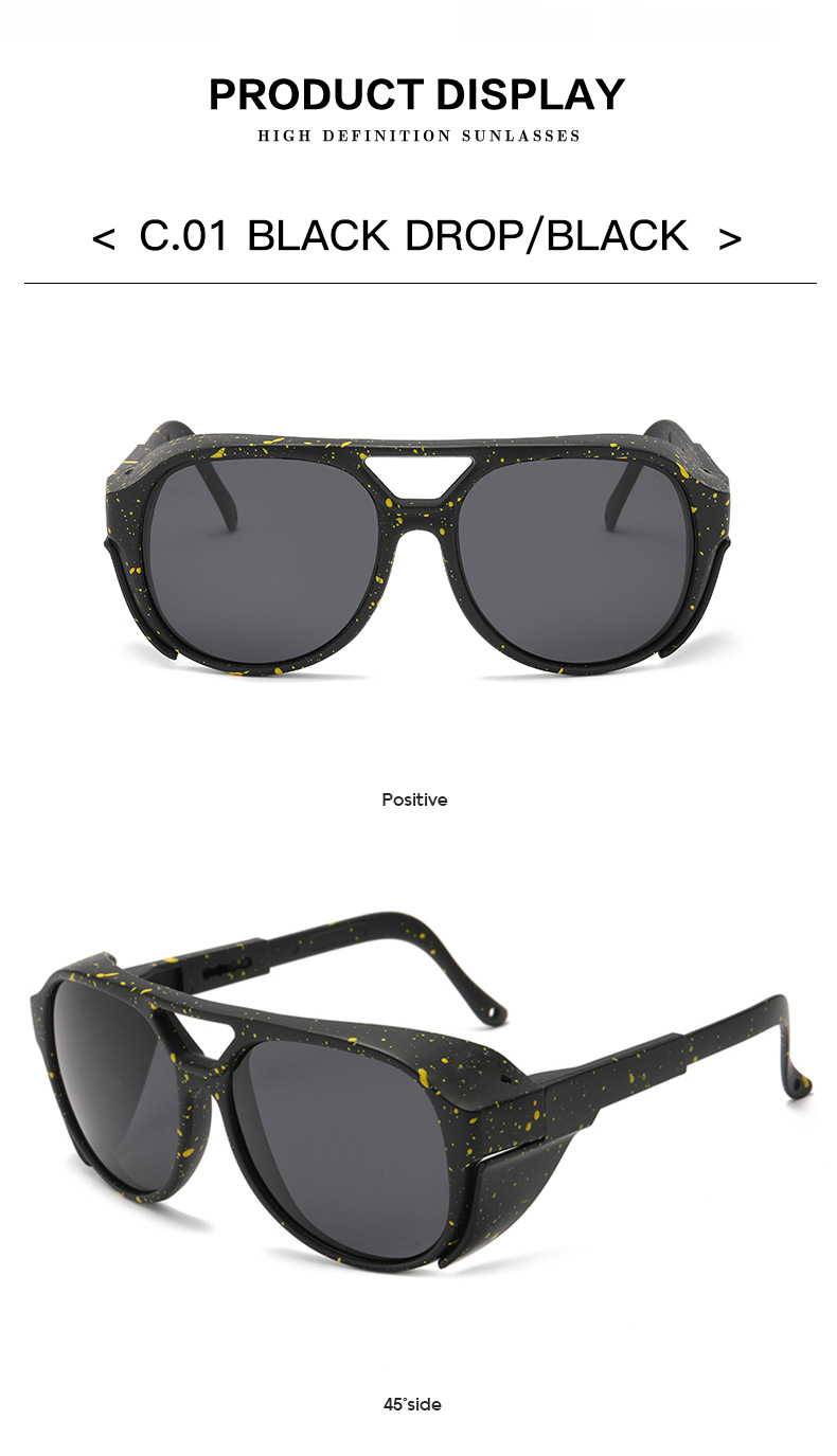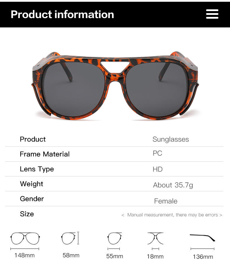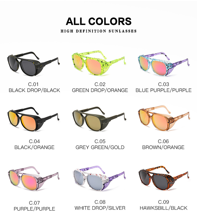 Color: Black frame Black gray lens C1, green frame black dot orange reflective C2, blue frame purple leg purple reflective C3, black frame orange reflective C4, gray green frame Green piece C5, tea frame orange reflective C6, purple frame purple reflective C7, white frame purple legs silver reflective C8, leopard frame gray C9